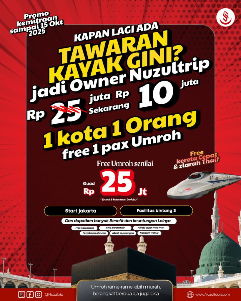 Nuzul Trip menawarkan kesempatan kepada anda yang ingin memiliki dan memulai usaha travel umroh bersama nuzultrip, yuk jadi OWNER CABANG NUZULTRIP di kotamu, garansi untung apabila tidak modal kami balikin 100%