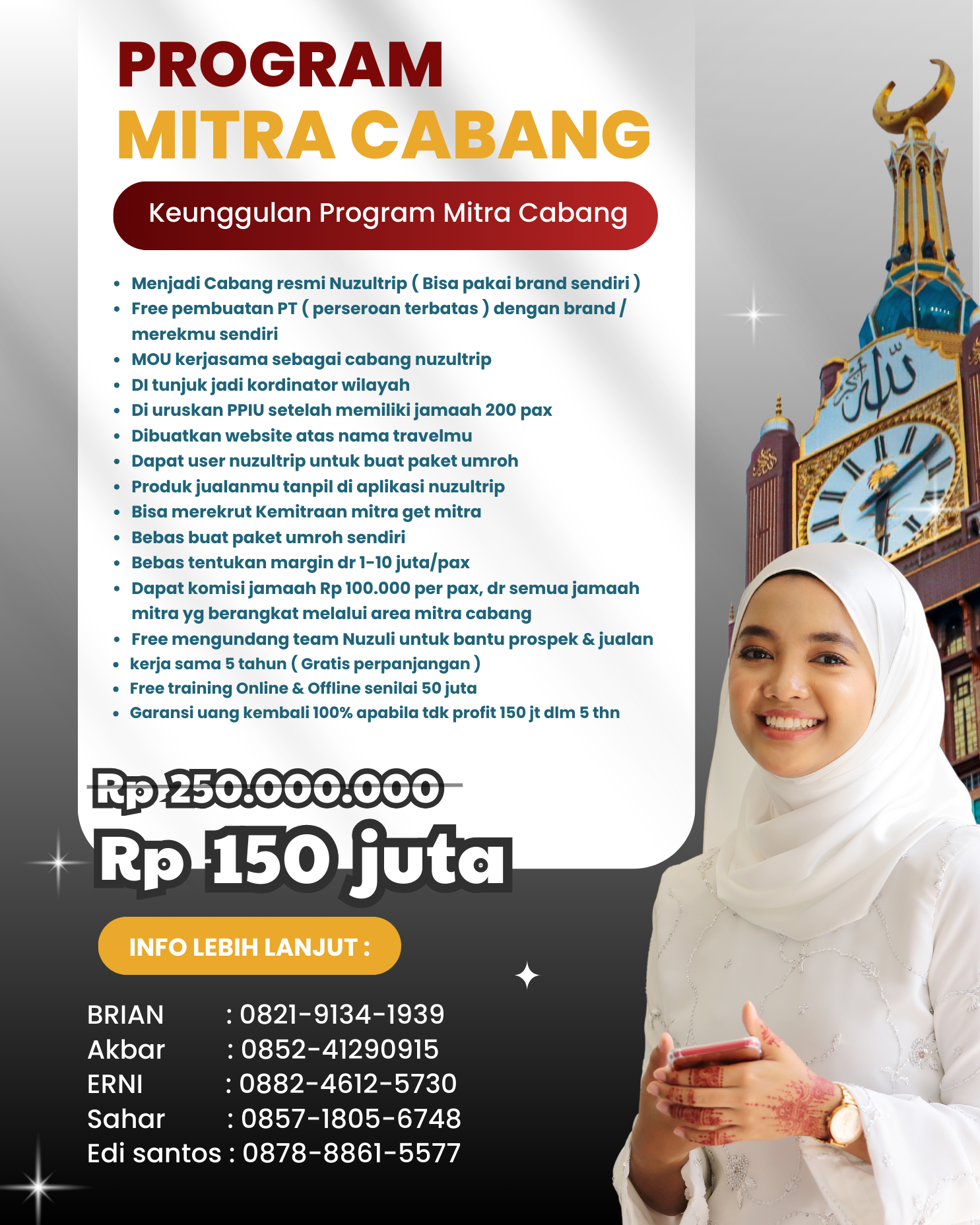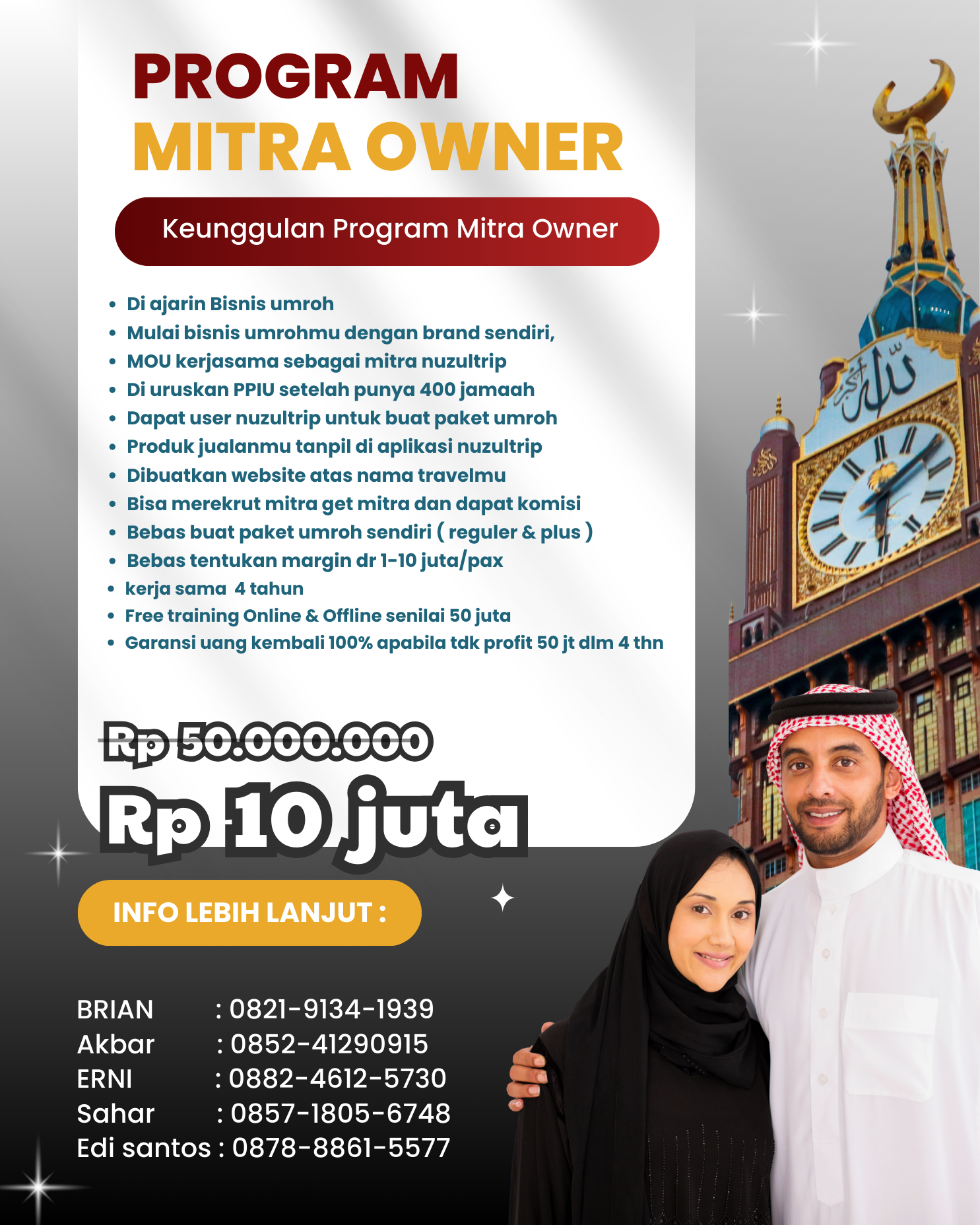 Dengan biaya kemitraan mulai dari 1 juta rupiah, Anda sudah bisa Jadi OWNER di travel umrohmu sendiri bersama Nuzuli — tanpa ribet urus izin dari nol