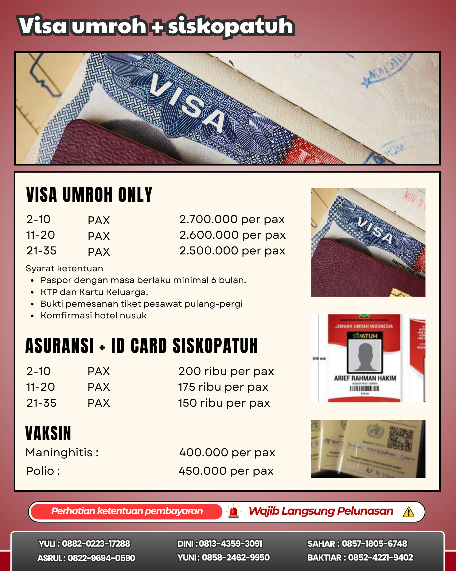 Kalau udah Punya tiket pesawat & Hotel selanjutnya kamu bisa pesan Komponen Umroh sama kami di nuzultrip seperti : Visa umroh, Transportasi, Handling airport, dan jasa mutawif